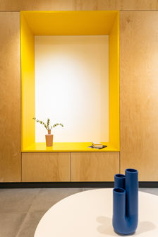 Un espacio de trabajo. Dos viviendas, una de ellas con una habitación y la otra con todo el espacio abierto. Las dos están configuradas de forma que una espina de madera de haya configura el espacio de salón y cocina, además de las zonas de almacenaje.